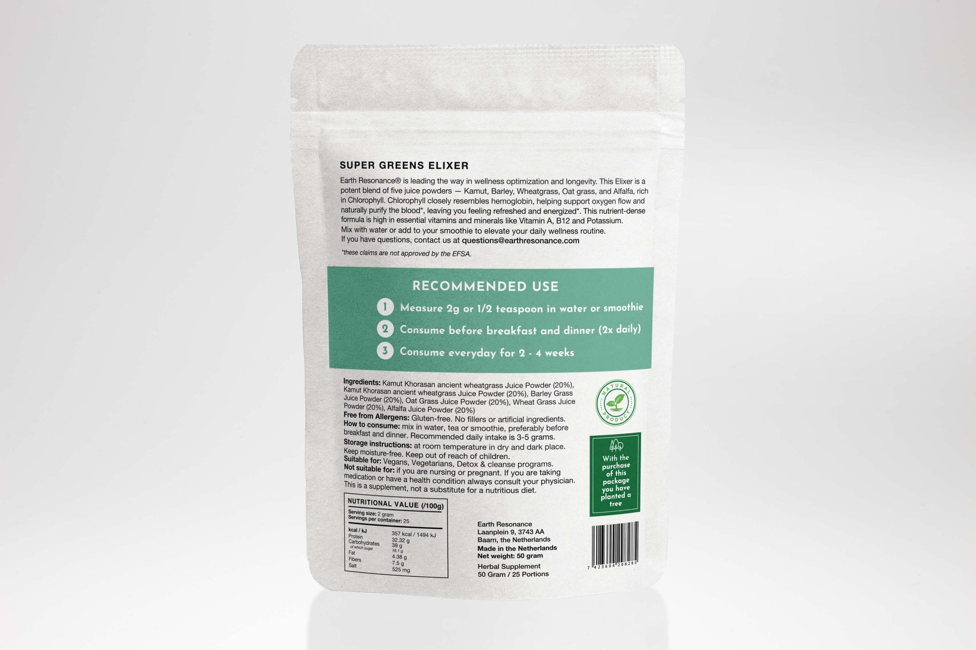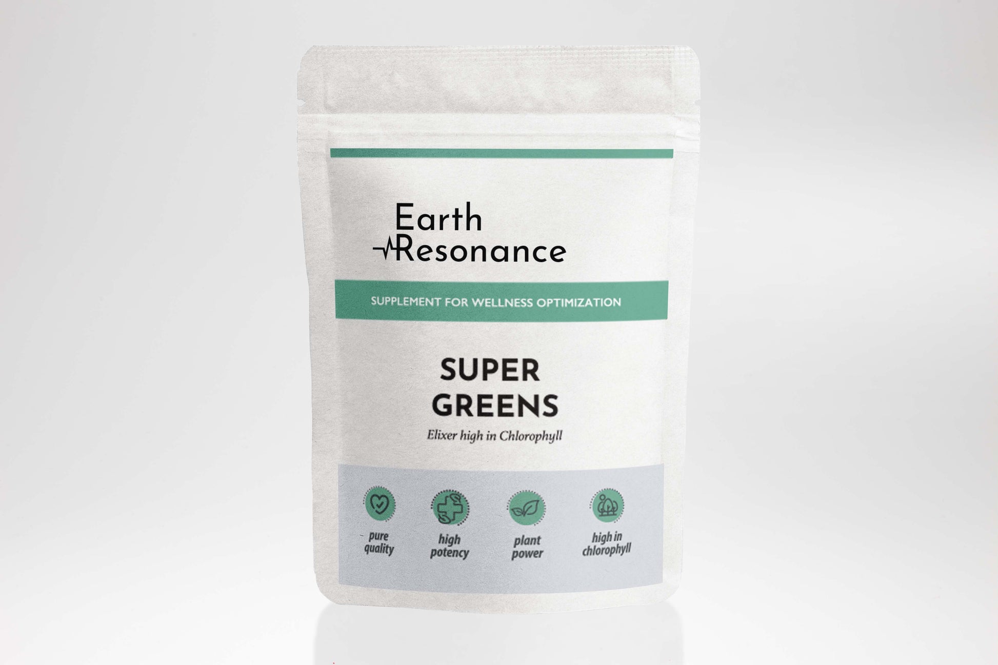 Earth Resonance® Super Greens Elixer is a blend of five vibrant green juice powders: Kamut, Barley, Wheatgrass, Oat Grass, and Alfalfa, all naturally rich in chlorophyll and plant nutrients.